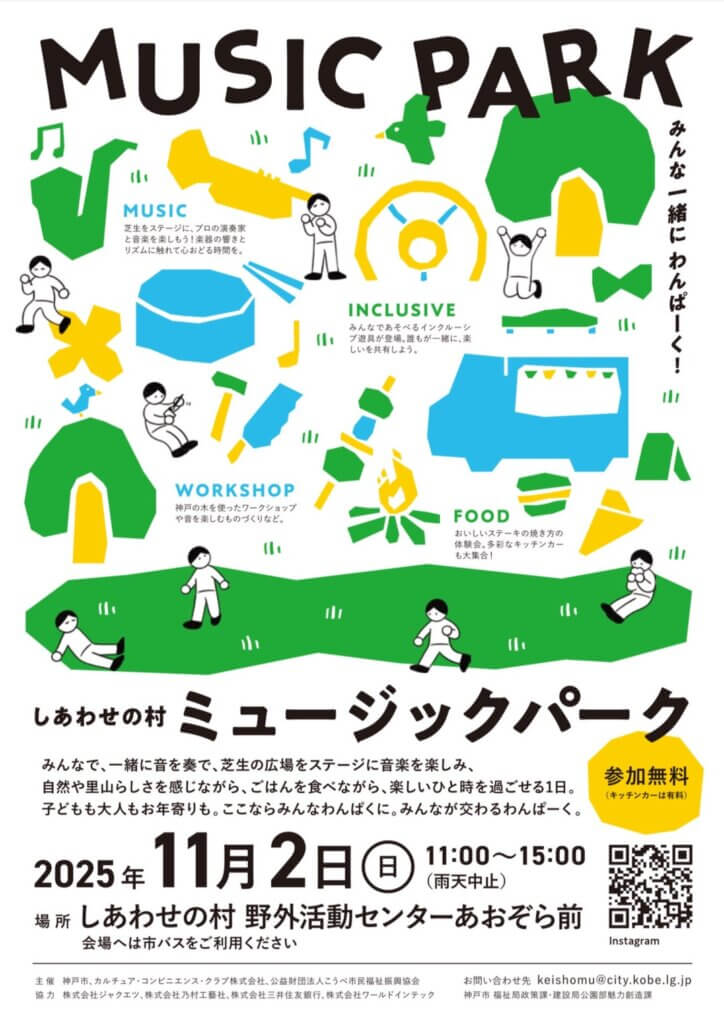 2025年11月2日(日)「しあわせの村」(神戸市北区しあわせの村1番)にて開催されるイベント「ミュージックパーク」に、ツナガリバンドの出演と、ミュージックボックスワークショップの共同出展で参加します。本イベントは性別、年齢、障がいの有無を問わずみんなが一緒に楽しめる場づくりを目指したイベントです。
